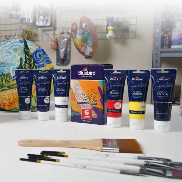 Signature Bluebird Signature Acrylic Colours 75 ml) are superior-quality water-based colors that provide artists with strokes of brilliant shade, fast drying and stability, water resistance, and a non-fading, durable finish. They are suitable for painting on porous surfaces like paper, canvas, fibreboard, craft foam, and wallpaper.