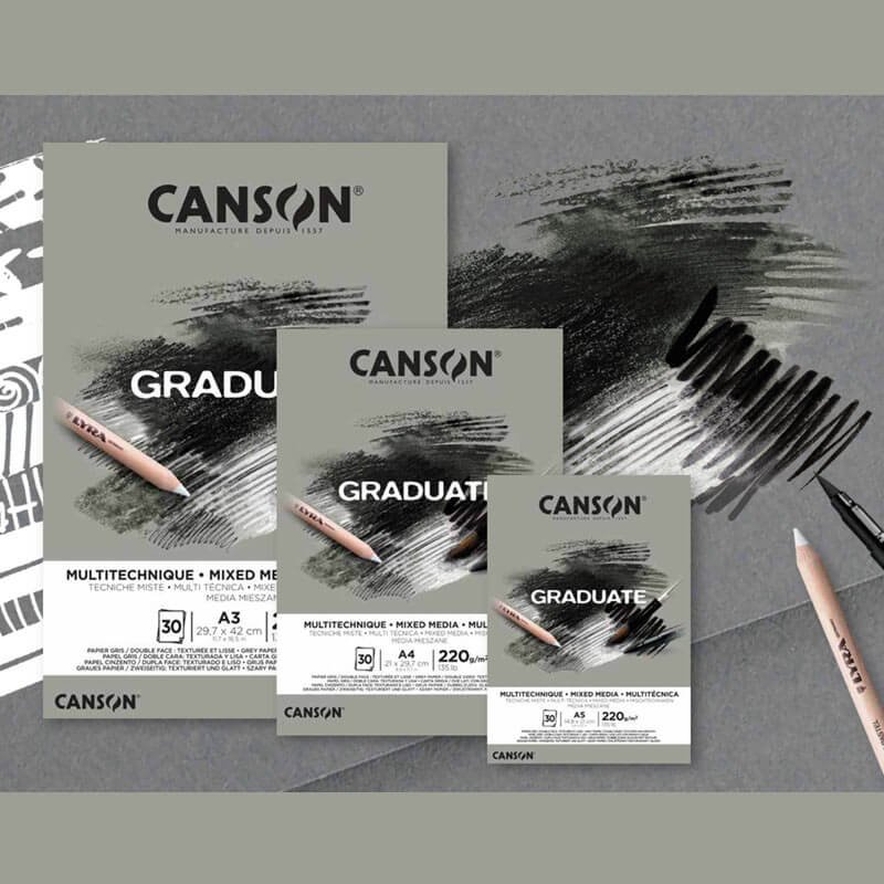 Canson Graduate Mixed Media Pad in Grey, featuring versatile 220 gsm paper. Designed for artists exploring various mediums, this pad offers a unique grey-toned surface that enhances contrast and depth in artworks. The medium-weight paper is suitable for both wet and dry techniques, including watercolor, acrylics, gouache, pencils, and ink. Each sheet is acid-free and provides excellent durability, allowing for multiple layers and corrections without deterioration. Whether you’re sketching, painting, or experimenting with mixed media techniques, the Canson Graduate Mixed Media Pad ensures consistent performance and professional-quality results.