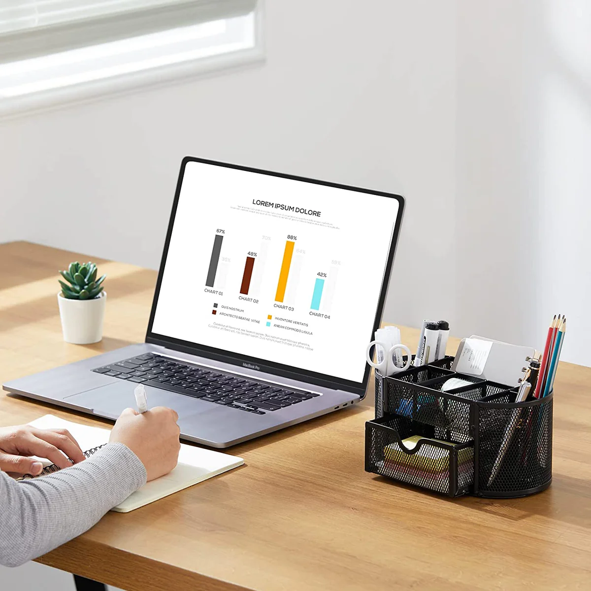 - Keeps desk essentials easily accessible.